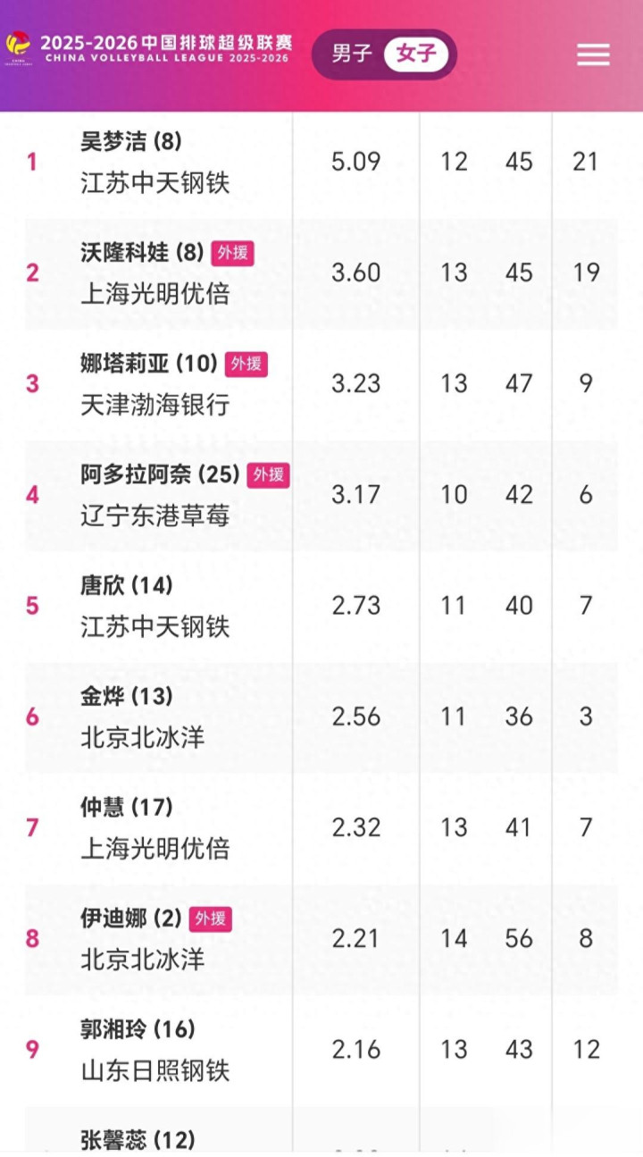 吴梦洁有效得分指数5.09,排名第一,她的整体表现非常出色,今年排超进步很大,这一点有目共睹,1.89米的身高,23岁的年龄,正值当打之年,弹跳出色,能超手进攻,一传进步很大,目前能接六轮一传,她不但能进国家队,很可能会成为国家队核心。唐欣也有较大进步,有效得分指数2.73,排名本土球员第二,关键是她主攻接应都能打,在国家队也已经证明过自己,唯一稍显不足的是,身高只有1.84米,稍微低了点。