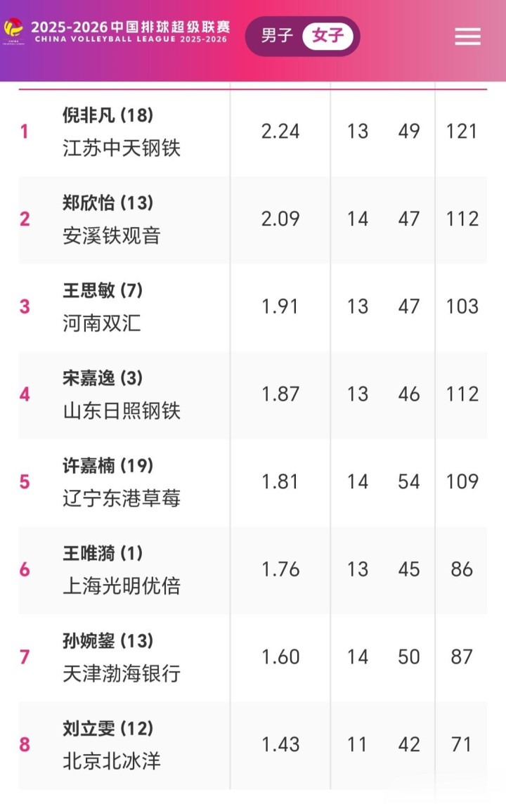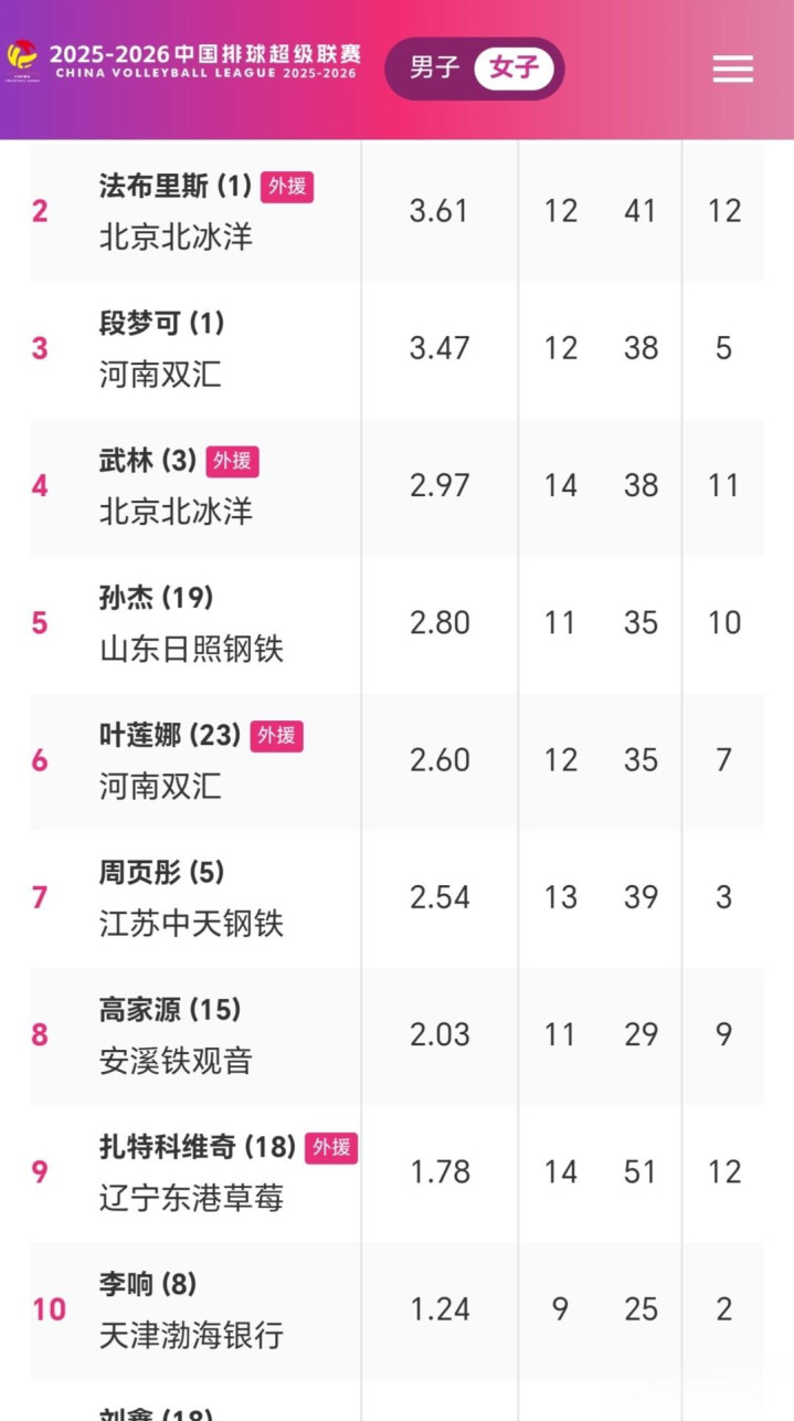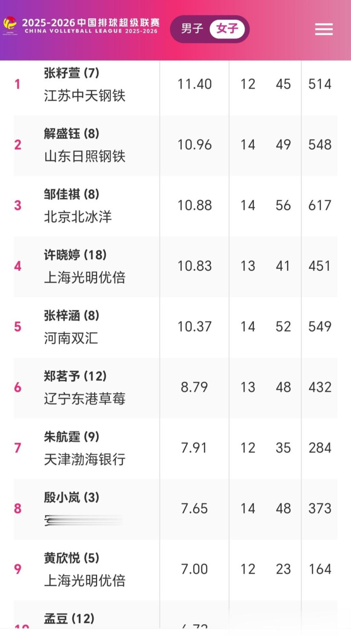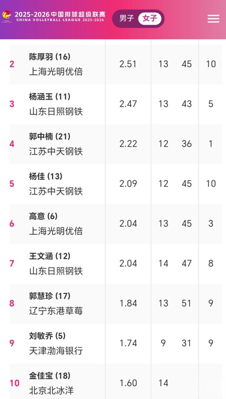 副攻有效得分指数小马丁超越陈厚宇排名第一,但是本土副攻表现稳定,陈厚宇2.51排名第二,杨涵玉2.47排名第三,郭中楠以2.22排名第四,杨佳2.09排名第五,高意2.04排名第六。副攻人才济济,竞争激烈,王文涵有效得分指数也是2.04,还有后面的郭慧珍、刘敏乔、金佳宝都不错,但是国家队集训估计只有六名球员,大概率会是王媛媛、陈厚宇、杨涵玉、郭中楠、杨佳、高意这六名球员,郭中楠才17岁,身高1.92米,移动拦网能力突出,昨天常规赛末轮8个拦网得分,非常出彩,对比之下万梓月、单琳倩、王奥芊可能会无缘了!